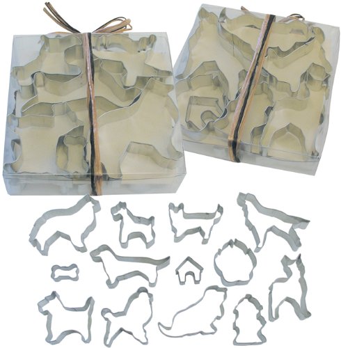 The ultimate 13 piece canine cookie cutter gift box. Includes: 5" collie, 4" poodle, 4" schnauzer, 5" dachshund, 4" scottie, mini 1.75" dog bone, 5" pincer, 3" fire hydrant, 4" corgi, 5" bassett, 5" pointer, 3" paw print, 1.75" dog house.